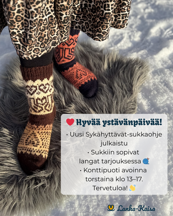 Ilmainen Sykähyttävät sukkaohje ja sukkiin sopivat langat tarjouksessa! Konttipuoti avoinna 12.2. klo 13-17 Tarjousaika 11.-15.2.2026 tai niin kauan kuin tarjoustuotteita riittää